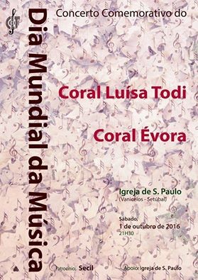 O primeiro Concerto da temporada 2016/2017 terá lugar no próximo dia 1 de Outubro, pelas 21h30, na Igreja de São Paulo, em Vanicelos (Setúbal). O Coral Luísa Todi e o Coral Évora juntam-se para comemorar este dia em que a música é o elemento principal. Será também a estreia do maestro Pedro Nascimento, como Diretor Artístico do Coral Évora. Fica o convite!