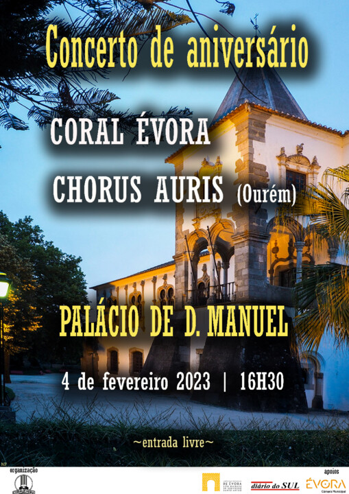 A sala principal do Palácio D. Manuel encheu, este sábado, para o concerto comemorativo do 44.º aniversário do Coral Évora. Para além do grupo aniversariante, o espetáculo contou com a atuação do Chorus AURIS, proveniente de Ourém. No final, foram homenageados alguns membros históricos do Coral Évora.