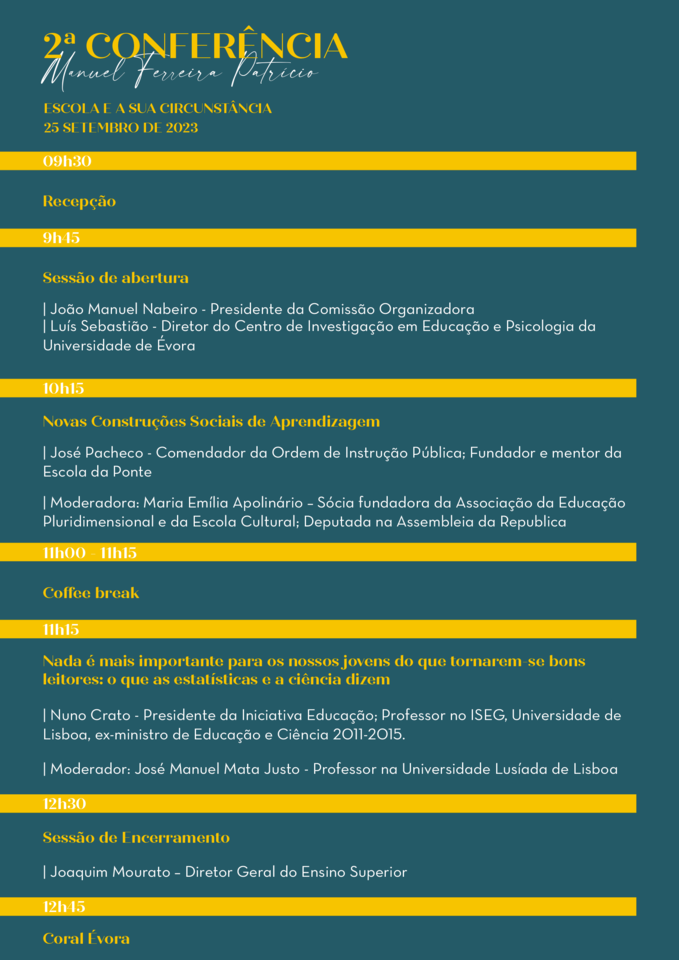 No dia 25 de Setembro realizou-se no Centro de Ciência do Café em Campo Maior a segunda Conferência "Manuel Ferreira Patrício" , sob o tema "A Escola e a sua circunstância", que teve a seguinte programação: